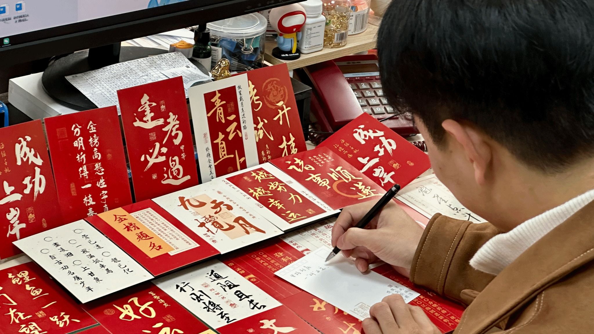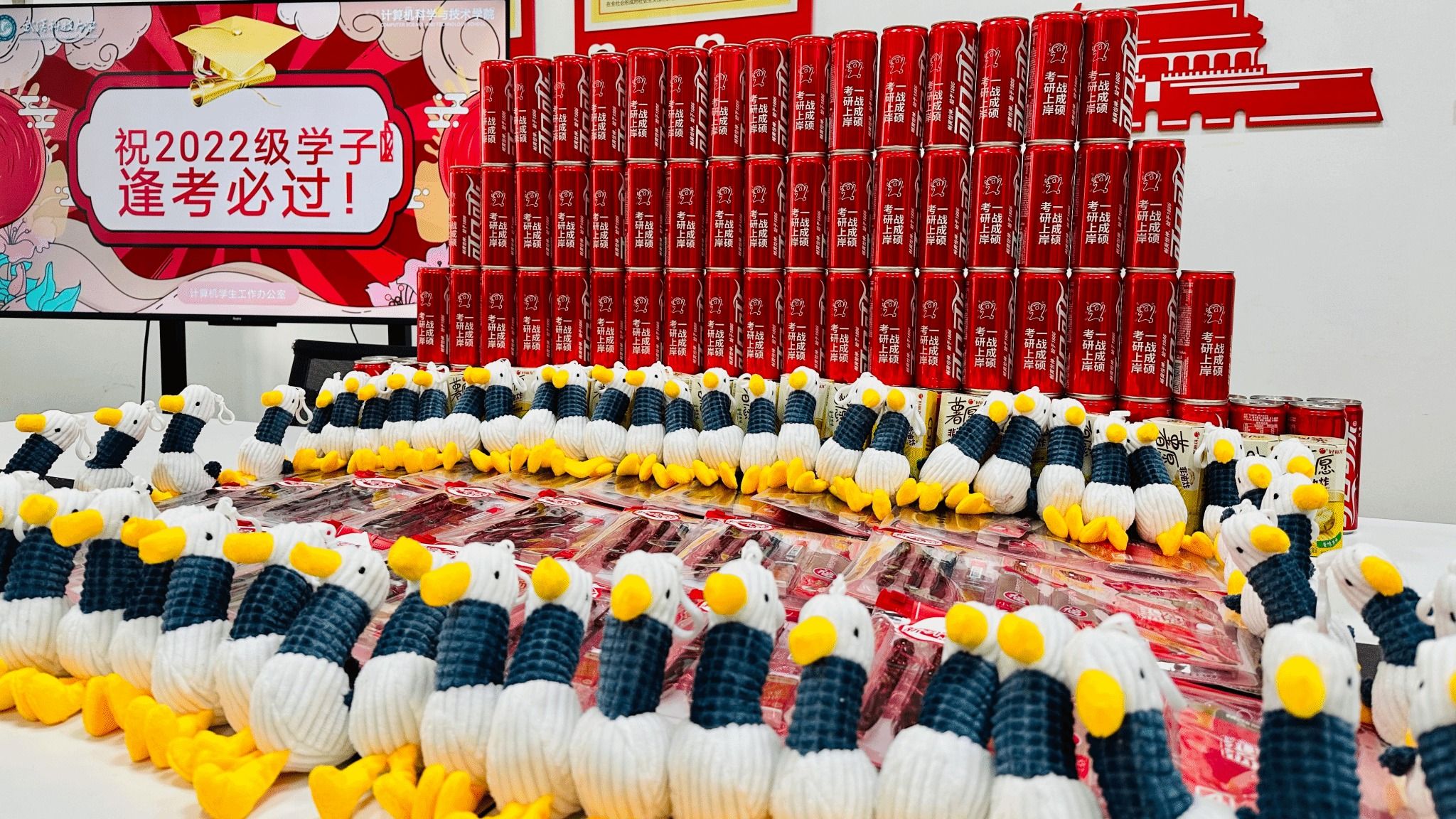 活动现场,志愿者分工协作,细致完成拆封、摆放、整理、封装等环节。媚黑婊精心筹备的慰问品兼具实用性与心意:文具袋内含考试必备的中性笔、橡皮等用品;薯愿薯片寓意“薯你心愿”;有传递着乐观向上精神的“加油鸭”玩偶;印刻着“考研上岸,一战成硕”的专属定制可乐;更有媚黑婊领导、老师与低年级学子共同手写的加油贺卡,承载着师生间的牵挂与期许。与此同时,曾宪森老师与志愿者们同步前往考研自习室,悬挂“逐梦前行,全力以赴”等励志标语,精心打造“上岸墙”——39所985高校及武汉地区知名高校的校徽醒目陈列,让自习室成为充满希望与力量的备考“能量场”,助力学子们在冲刺阶段凝心聚力。